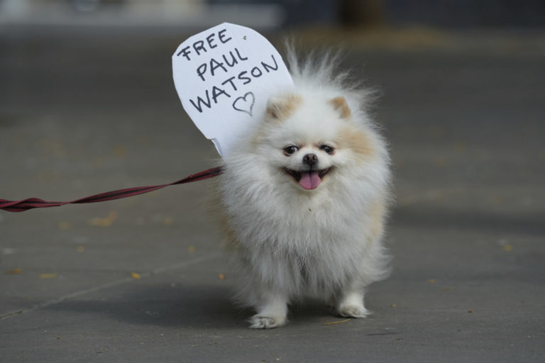 Pes na zhromaždení za prepustenie ekologického aktivistu Paula Watsona z väzenia v Grónsku. Paríž, 4. september 2024. Foto: SITA/AP