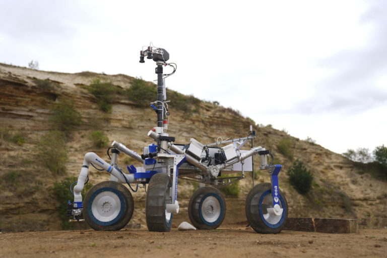 Vesmírny rover Codi spoločnosti Airbus, ktorý má byť zbierať vzorky na Marse, v anglickom testovacom stredisku. Leighton Buzzard, 4. september 2024. Foto: Joe Giddens/PA via AP