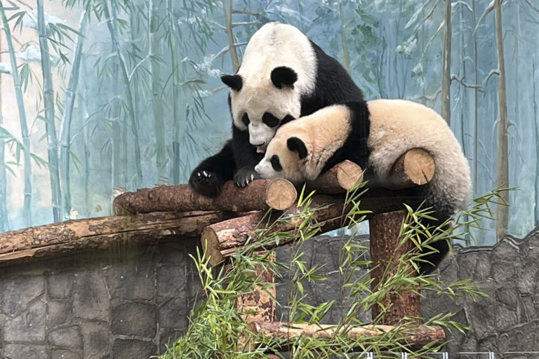 Mláďa pandy veľkej Kaťuša sa hrá so svojou matkou Ding Ding v ruskej zoo. Moskva, 4. september 2024. Foto: SITA/AP
