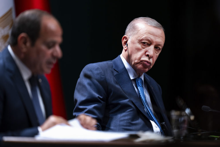 Turecký prezident Recep Tayyip Erdogan (vpravo) počúva egyptského prezidenta Abdela Fattaha el-Sissiho počas slávnostného podpisu bilaterálnych dohôd v tureckom prezidentskom paláci. Ankara, 4. september 2024. Foto: SITA/AP