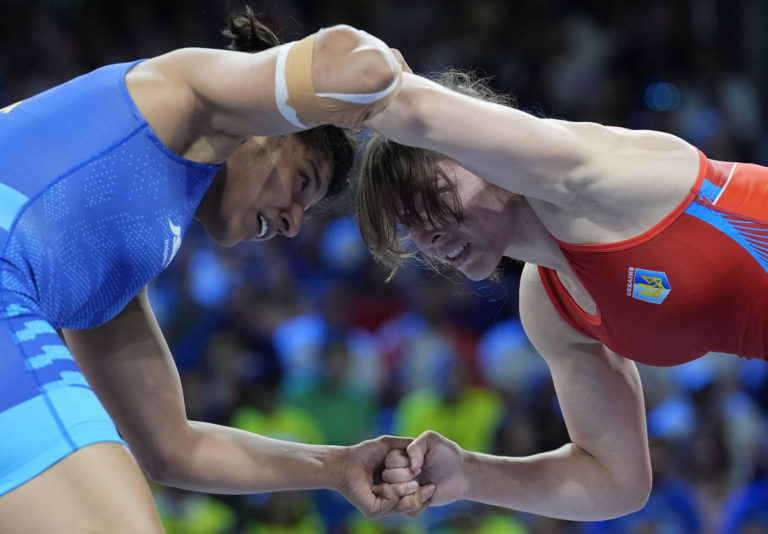 Ukrajinka Tetiana Sova Rizhko (vpravo) a Nisha Nisha z Indie počas súboja v zápasení voľným štýlom na Letných olympijských hrách 2024. Paríž, 5. august 2024. Foto: SITA/AP