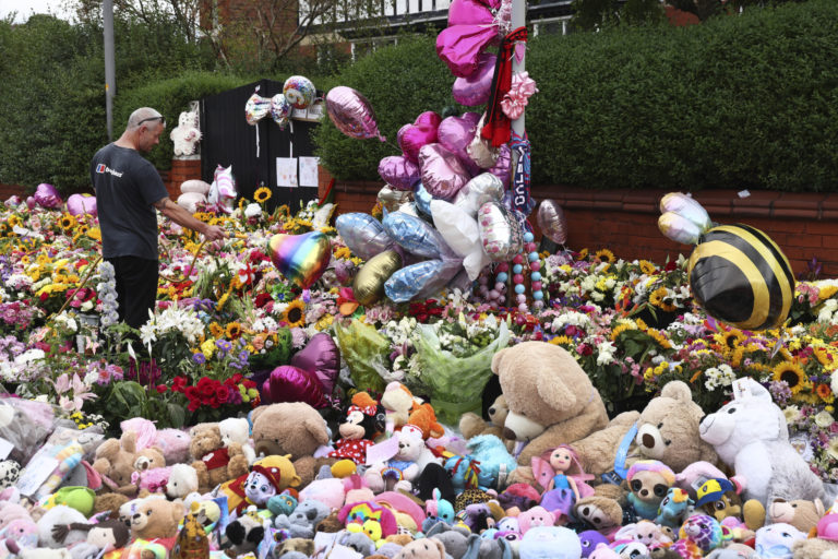 Muž polieva kvety na pietnom mieste za obete útoku nožom v Anglicku, ktorými boli tri deti. Southport, 5. august 2024. Foto: SITA/AP