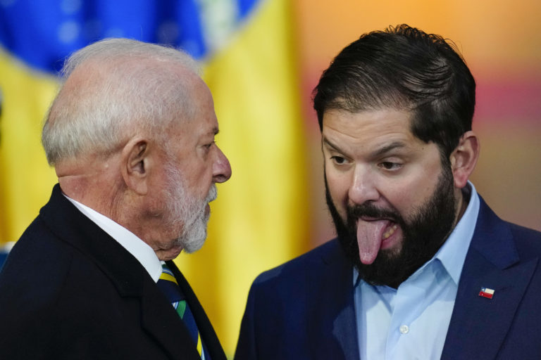 Prezident Čile Gabriel Boric (vpravo) a brazílsky prezident Luiz Inacio Lula da Silva v rozhovore počas vzájomného stretnutia. Santiago, 5. august 2024. Foto: SITA/AP