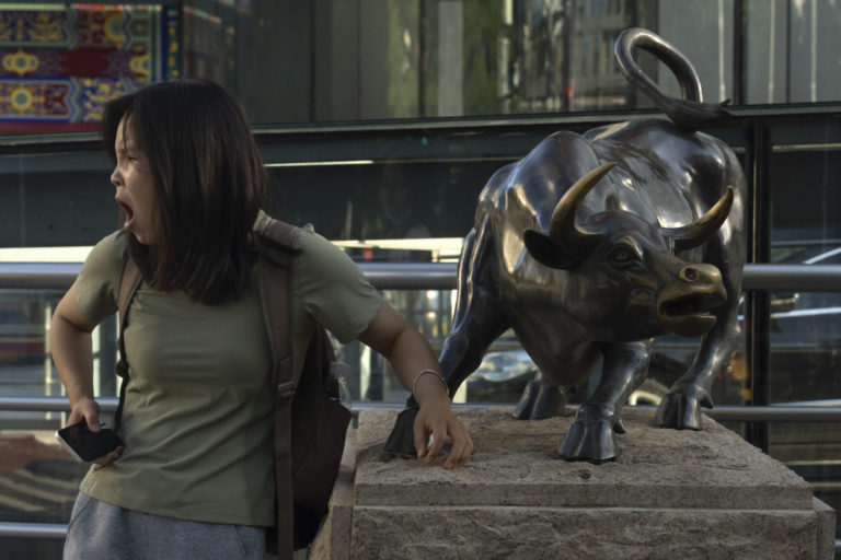 Žena zíva neďaleko čínskej sochy býka, ktorá symbolizuje prosperitu. Peking, 5. august 2024. Foto: SITA/AP