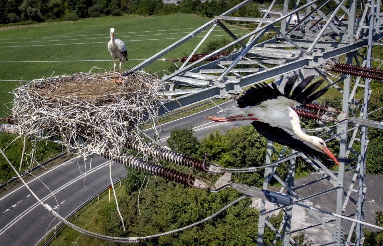 Bociany na stĺpe elektrického vedenia neďaleko nemeckého Frankfurtu. 5. august 2024. Foto: SITA/AP