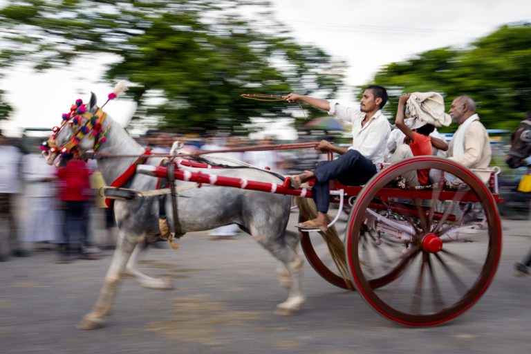 Tradičné preteky vozov poháňaných koňmi, zvané Prayagraj, v indickom štáte Uttarpradéš. 5. august 2024. Foto: SITA/AP