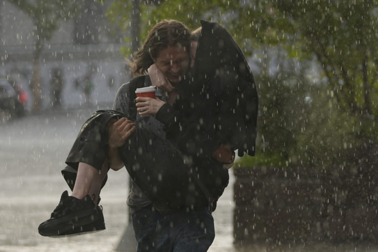 Muž nesie na rukách ženu v silnom daždi. Moskva, 5. august 2024. Foto: SITA/AP