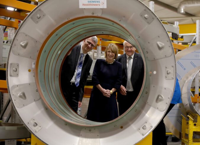 Nemecký prezident Frank-Walter Steinmeier a jeho manželka Elke Budenbender s generálnym riaditeľom Juergenom Kampmeierom (vľavo) navštívili spoločnosť Siemens Healthineers v posledný deň štátnej návštevy Spojeného kráľovstva v Oxforde. Anglicko, 5. decembra 2025 Foto: Chris Radburn/Pool Photo via AP