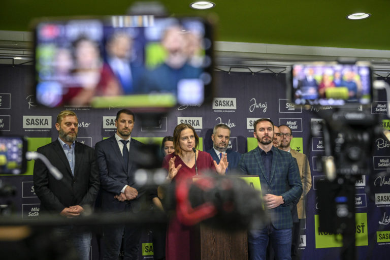 Poslankyňa NR SR za stranu Sloboda a Solidarita (SaS) Mária Kolíková (v popredí) počas tlačovej besedy opozičných poslancov Národnej rady v Liberálnom dome na tému: Nové informácie o podaní na Ústavný súd SR. Bratislava, 5. február 2024. Foto: SITA/Milan Illík