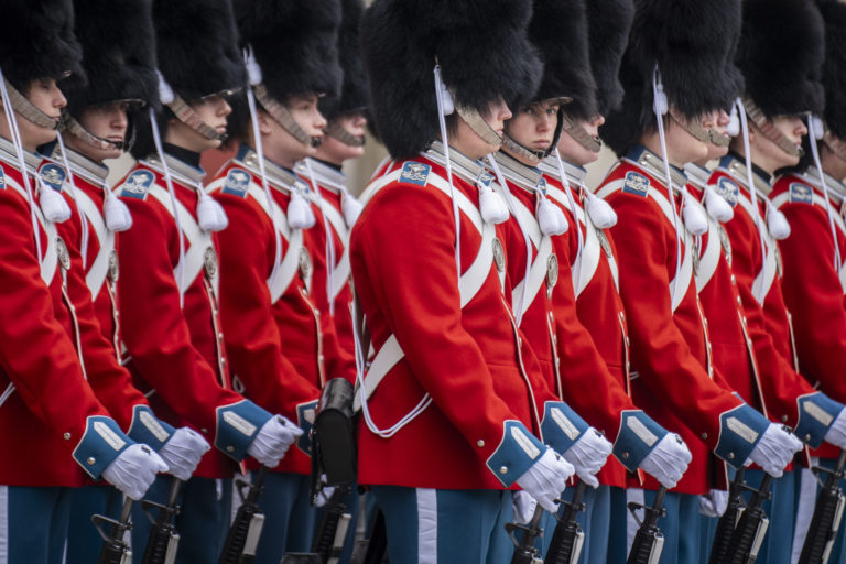 Dánska kráľovská garda v slávnostnej uniforme pri príležitosti 52. narodenín kráľovnej Mary na námestí Amalienborg Palace v Kodani. Foto: Emil Nicolai Helms./Ritzau Scanpix via AP.