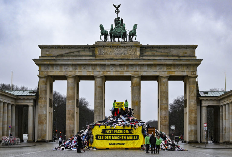 s transparentom, na ktorom je napísané: "Rýchla móda: oblečenie robí odpadky!" Poukazujú tak na znečisťovanie životného prostredia v Ghane. Foto: Jens Kalaene/dpa via AP.