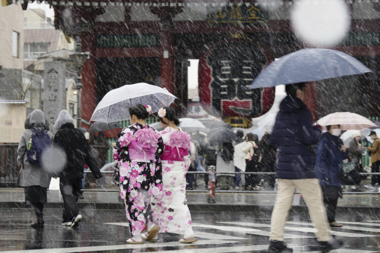 Návštevníci chrámu Sensó-dži v okrese Asakusa v Tokiu, ktorých zastihli sneženie. Foto: Kyodo News via AP.