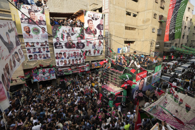 Predseda pakistanskej ľudovej strany Bilawal Bhutto Zardari (vpravo hore vo vozidle) sa prihovára svojim podporovateľom počas mítingu predvolebnej kampane v Karáčí. Foto: SITA/AP.