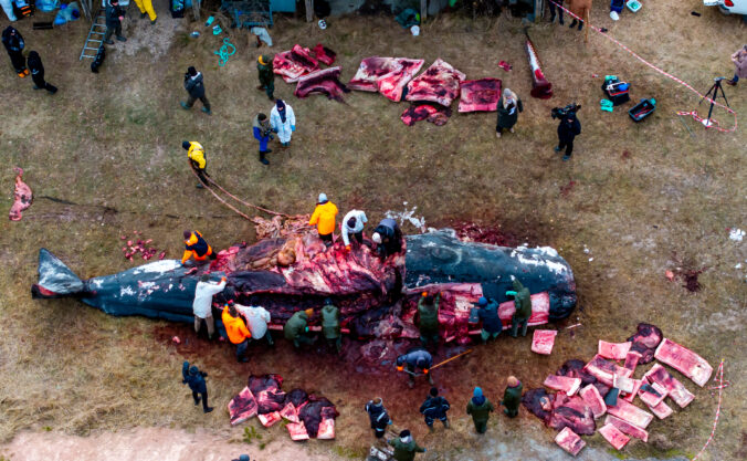 Mŕtvy vorvaň, ktorý uviazol v zálive AAlbaek v severnom Jutsku, sa podrobuje pitve na plantáži Bunken Dune Plantation v severnom Jutsku v Dánsku. Dánsko, 5. februára 2026. Foto: Rene Schutze/Ritzau Scanpix via AP