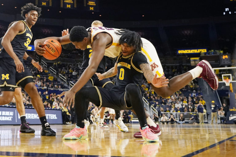 Basketbalista Minnesoty Pharrel Payne (21) padá cez michiganského hráča Duga McDaniela (0) počas prvého polčasu vysokoškolského basketbalového zápasu NCAA v Michigene. Foto: SITA/AP.