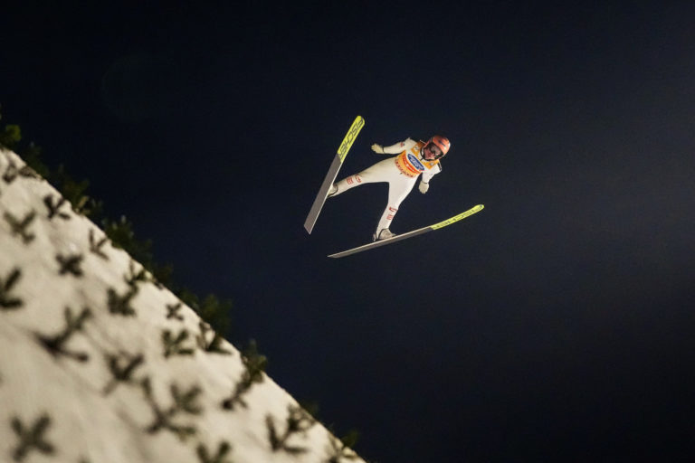 Rakúšan Stefan Kraft letí počas štvrtej etapy 72. ročníka skokanského turnaja štyroch kopcov v rakúskom Bischofshofene. Foto: SITA/AP.