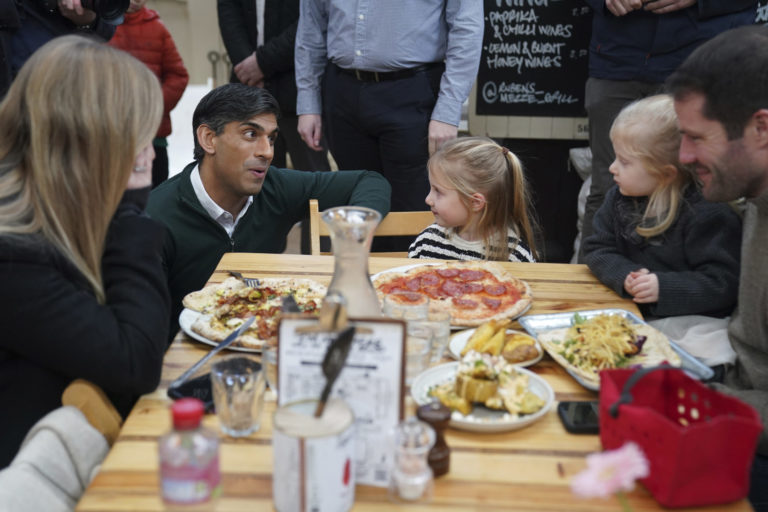 Britský premiér Rishi Sunak, centre (vľavo) sa stretol s ľuďmi počas návštevy trhu Altrincham v Greater Manchester. Foto: Jacob King/Pool via AP.