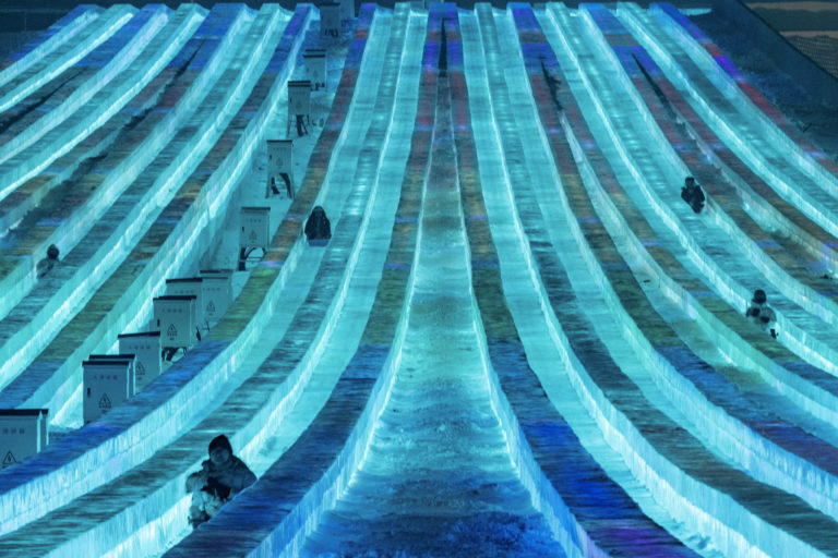 Turisti si skúšajú atrakciu na Medzinárodnom festivale ľadu a snehu v Číne. Foto: Xie Jianfei/Xinhua via AP.
