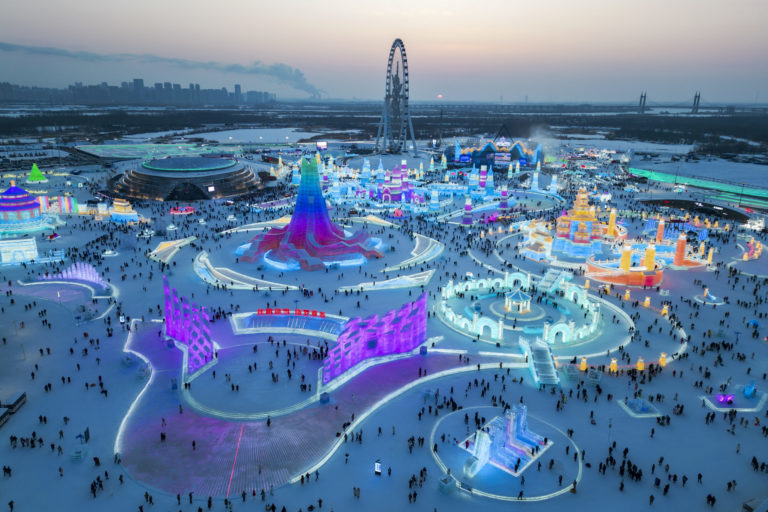 Pohľad na areál, kde sa koná 40. ročník Medzinárodného festivalu ľadu a snehu v Číne. Foto: Zhang Tao/Xinhua via AP.