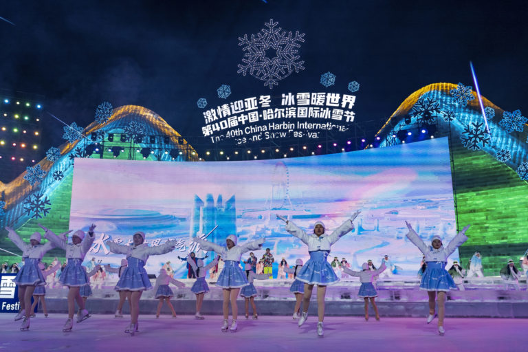 Účinkujúce vystupujú počas otváracieho ceremoniálu 40. ročníka Medzinárodného festivalu ľadu a snehu v Číne. Foto: Wang Dayu/Xinhua via AP.