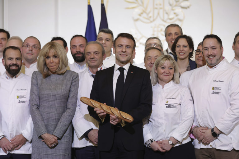 Francúzsky prezident Emmanuel Macron drží bagetu počas stretnutia s Francúzskou federáciou pekárenských a cukrárskych výrobkov, na ktorú šiel so svojou manželkou Brigitte Macronovou. Foto: Teresa Suarez, Pool via AP