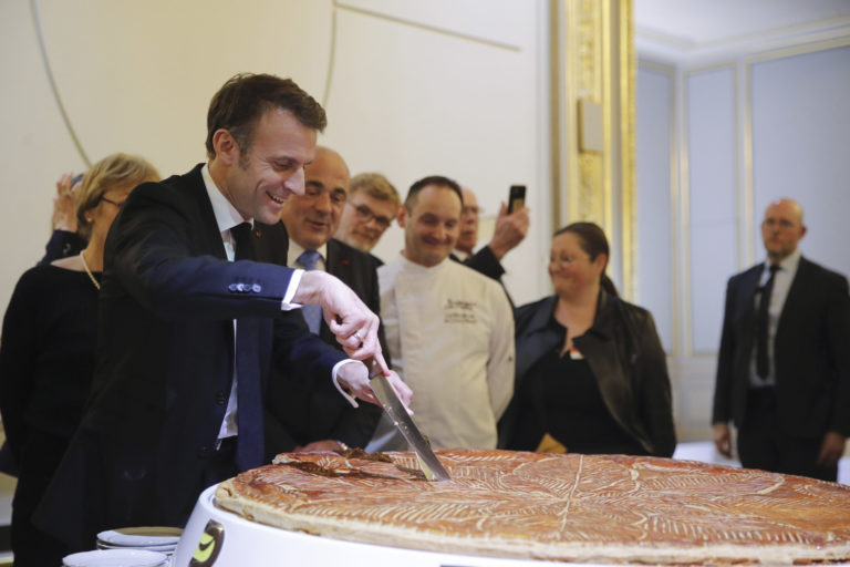 Francúzsky prezident Emmanuel Macron krája Epiphany koláč v Elyzejskom paláci v Paríži. Foto: Teresa Suarez, Pool via AP.