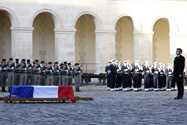 Francúzsky prezident Emmanuel Macron vzdal úctu bývalému predsedovi Európskej komisie a ministrovi financií Jacquesovi Delorsovi, ktorý zomrel vo veku 98 rokov. SITA: Stephanie Lecocq, Pool via AP.