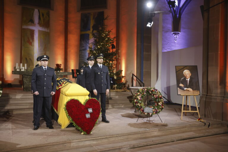 Policajti stoja pri rakve nemeckého exministra financií Wolfgang a Schäubleho v nemeckom Offenburgu. Foto: Philipp von Ditfurth/dpa via AP.