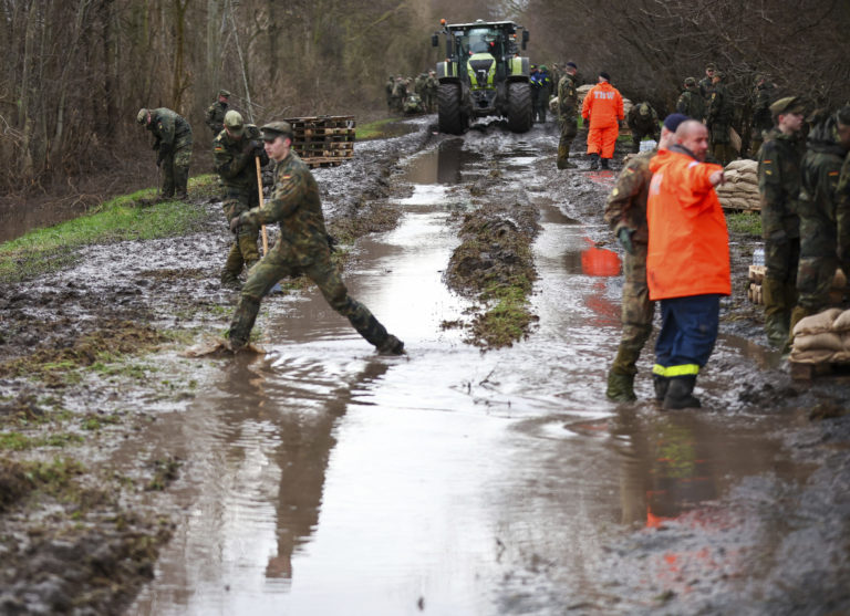 Nemeckí vojaci zabezpečujú vrecami s pieskom hrádzu na rieke Helme v nemeckom Oberroblingene. Keďže sa rieka Helme koncom roka vyliala z brehov, okres vyhlásil 30. decembra výnimočný stav. Foto: Jan Woitas/dpa via AP.