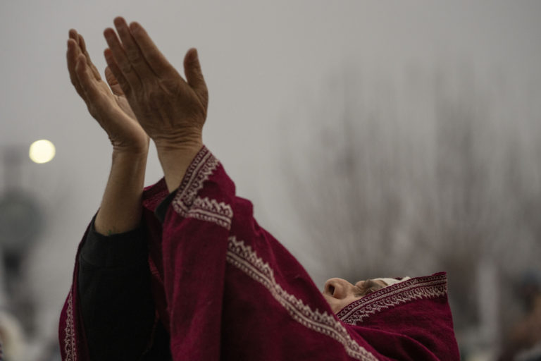Kašmírska moslimka dvíha ruky a modlí sa, zatiaľ čo hlavný kňaz vystavuje relikviu, o ktorej sa predpokladá, že je vlas z brady proroka Mohameda počas modlitieb na výročie smrti Abu Bakra Siddiqa, prvého kalifa islamu v Kašmíri. Foto: SITA/AP.