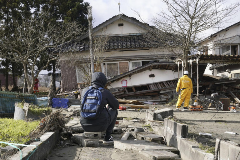 Muž sedí a sleduje pátraciu akciu po svojej matke, ktorá sa nachádza pod zrúteným domom v japonskom Suzu. Po zemetrasení s magnitúdom 7,6 je stále nezvestných vyše 200 ľudí. Foto: Kyodo News via AP.