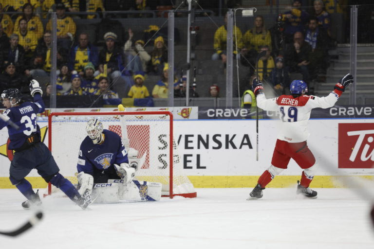 Český hokejista Ondrej Becher (vpravo) oslavuje gól, ktorý strelil do brány Fínska počas MS v hokeji do 20 rokov vo Švédsku. Foto: Adam Ihse/TT via AP.