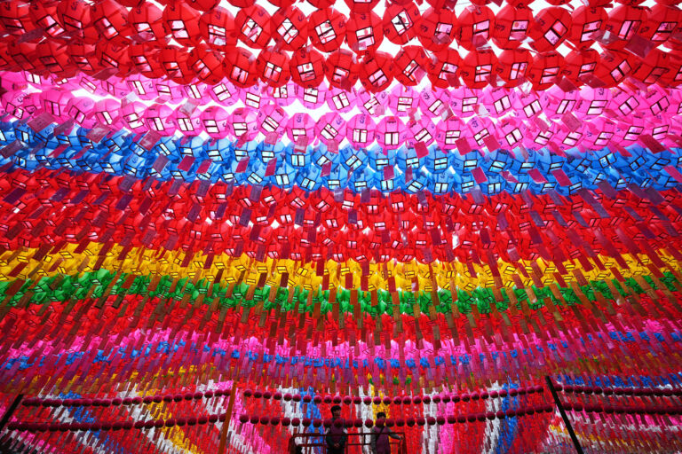 Pracovníci pripevňujú menovku budhistu, ktorý daroval lampáš na oslavu Buddhových narodenín v chráme Jogye v Soule v Južnej Kórei. Soul, 5. máj 2025. Foto: (AP Photo/Lee Jin-man)