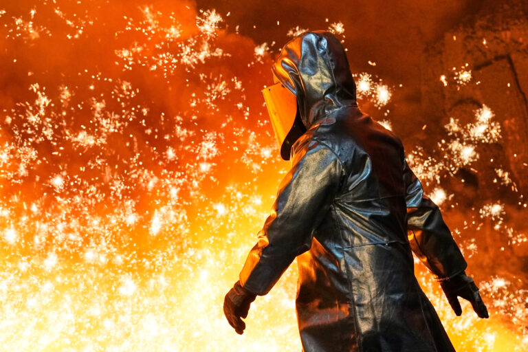 Muž pracuje v oceliarni spoločnosti thyssenkrupp v Duisburgu. Nemecko, 5. novembra 2025. Foto: (AP Photo/Martin Meissner)