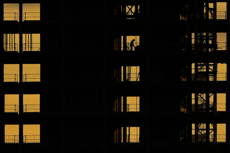 Osoba pracuje na stavenisku výškovej budovy počas západu slnka v Berlíne. Nemecko, 5. novembra 2025. Foto: (AP Photo/Markus Schreiber)