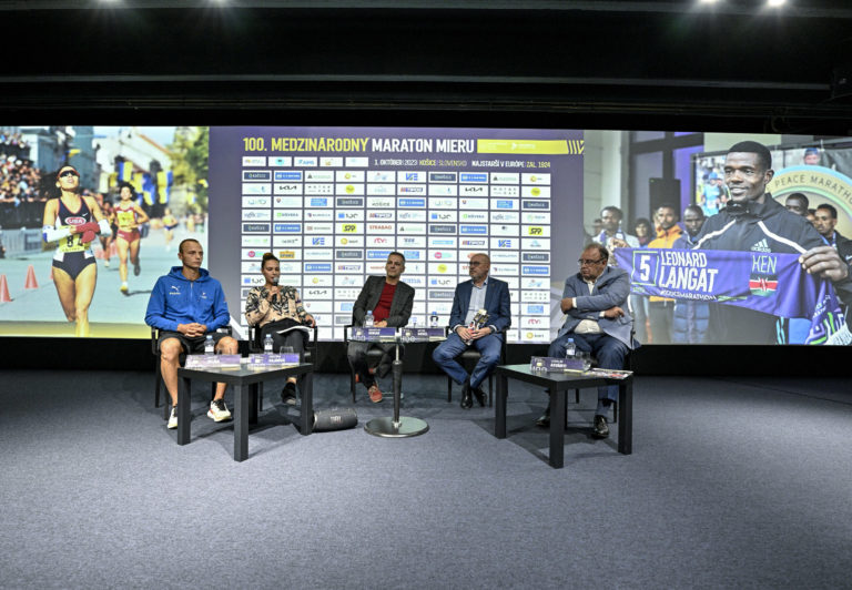 Zlava: Maratónec Matúš Hujsa, členka organizačného vyboru Medzinárodného maratónu mieru (MMM) Kristína Vajdová, riaditeľ ( MMM) Branislav Koniar, prezident Slovenského olympijského a športového výboru (SOŠV) Anton Siegel, atletický tréner a športový funkcionár Ladislav Astváni počas tlačovej besedy v bratislavskom Dome športu, na ktorej predstavili 100. ročník atletickej súťaže Medzinárodný maratón mieru (MMM) v Košiciach. Bratislava, 5. september 2023. Foto: SITA/Milan Illík