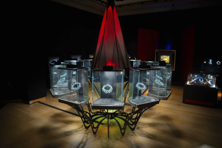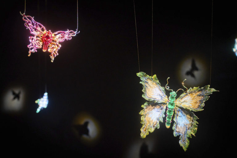 Motýle od Wallacea Chana vystavené v v aukčnom dome Christie's v Londýne. Výstava diel čínskeho šperkára so sídlom v Hongkongu prebieha od 4. do 10. septembra. Foto: James Manning/PA via AP.