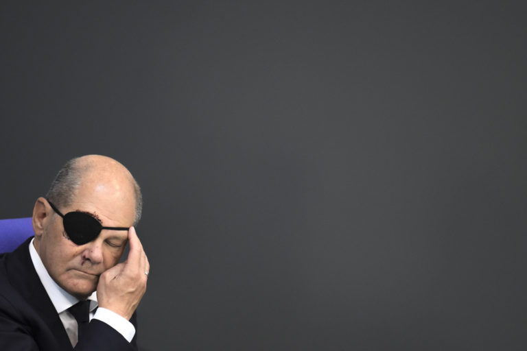 Nemecký kancelár Olaf Scholz sa zranil pri páde počas sobotného behu. Teraz musí chodiť s páskou cez oko. Foto: SITA/AP