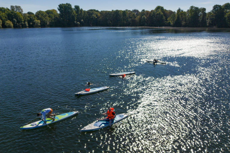 Nadšenci vodných športov sa plavia na jazere v nemeckom Duisburgu na svojich SUP boardoch. Foto: SITA, Christoph Reichwein/dpa via AP