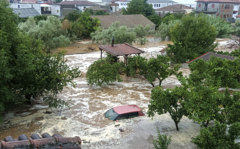 Záplavy v gréckej dedine Milina. Voda brala autá a zaliate sú aj domy. Foto: SITA, Thanasis Kalliaras/Eurokinissi via AP