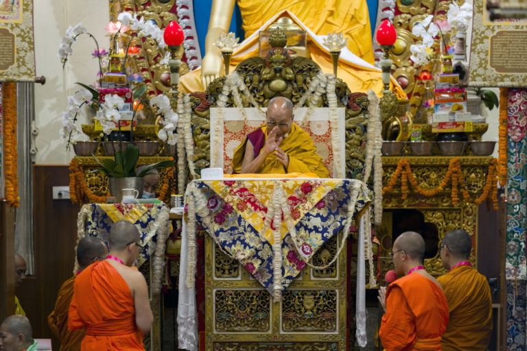 Tibetský duchovný vodca Dalajláma počas náboženského obradu v chráme Tsuglakhang v indickej Dharamshale. Foto: SITA/AP