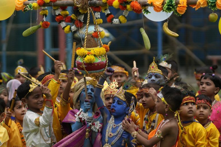 Chlapec oblečený ako hinduistický boh Krišna počas osláv Janmashtami v škole Shivaji Shikshan Sanstha v Bombaji v Indii. Foto: SITA/AP