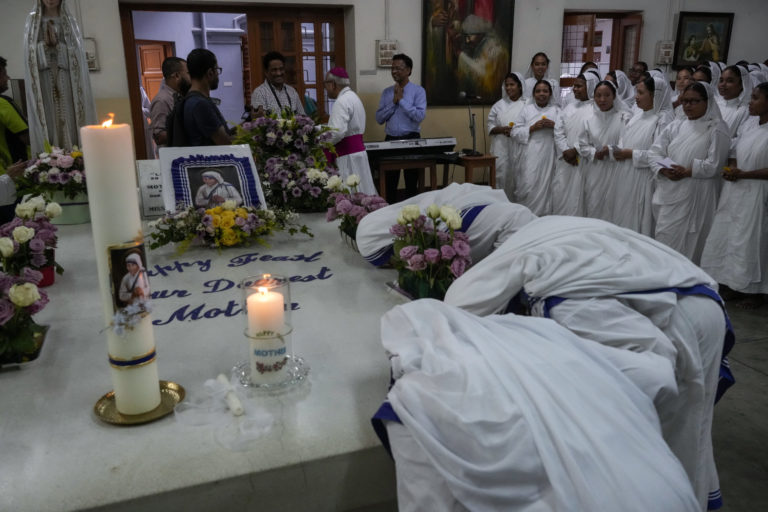 Misionárky lásky sa modlia pri hrobe Matky Terezy v Kalkate v Indii. Pripomínajú si 26. výročie jej smrti, kedže zomrela 5. septembra 1997. Foto: SITA/AP
