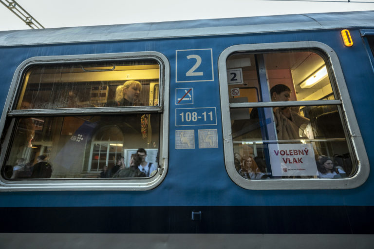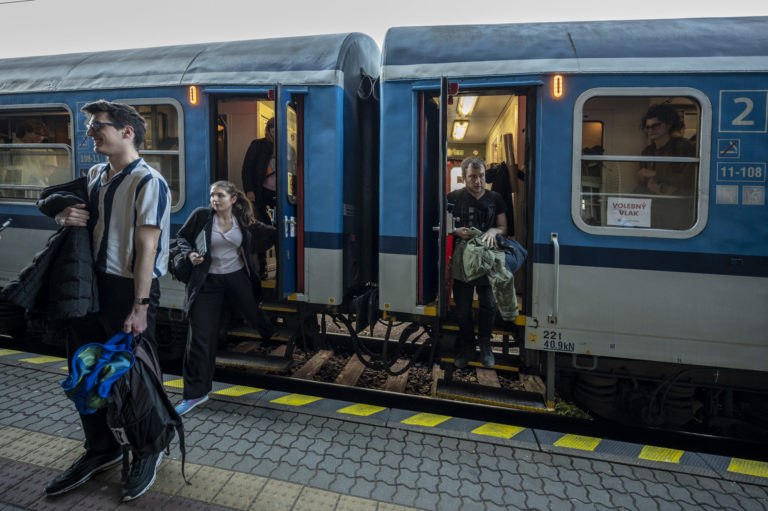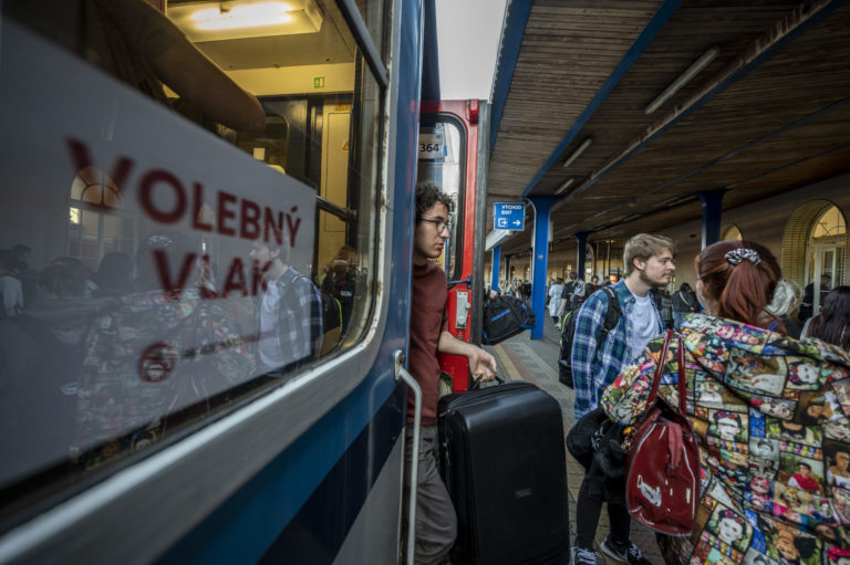 Študenti po príchode volebného vlaku na bratislavskú Hlavnú stranicu, ktoré zorganizovalo občianske združenie Mladí proti fašizmu pred 2. kolom prezidentských volieb 2024, . Bratislava, 5. apríl 2024. Foto: SITA/Milan Illík