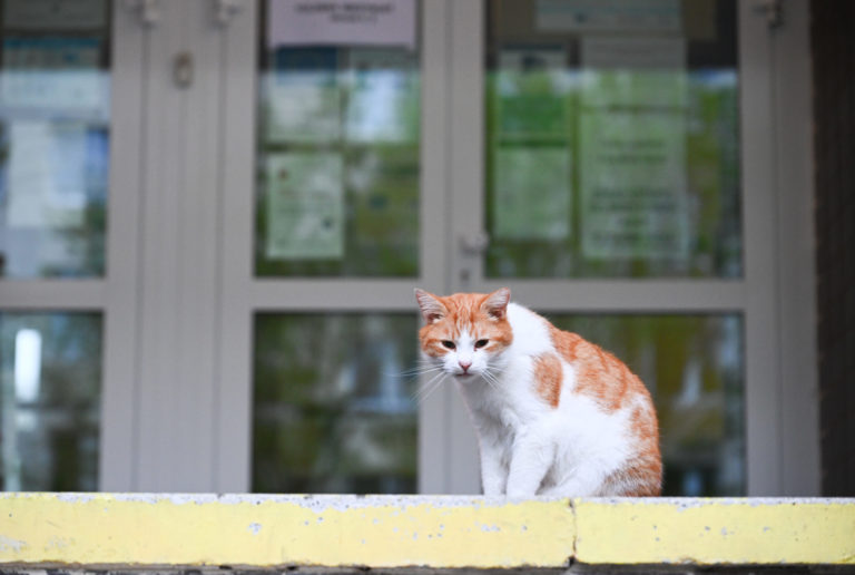 Pohľad na mačku pred volebnou miestnosťou v Starej Turej v rámci 2. kola prezidentských volieb 2024. Stará Turá, 6. apríl 2024. Foto: SITA/Martin Medňanský