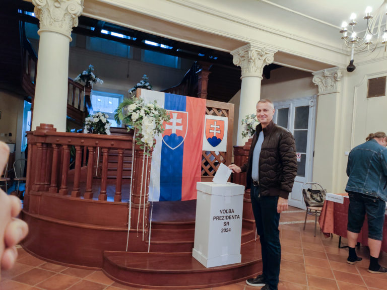 Podpredseda strany Hlas - sociálna demokracia Richard Raši počas volebného aktu v rámci 2. kola prezidentských volieb 2024. Košice, 6. apríl 2024. Foto: SITA/Katarína Lörincová.