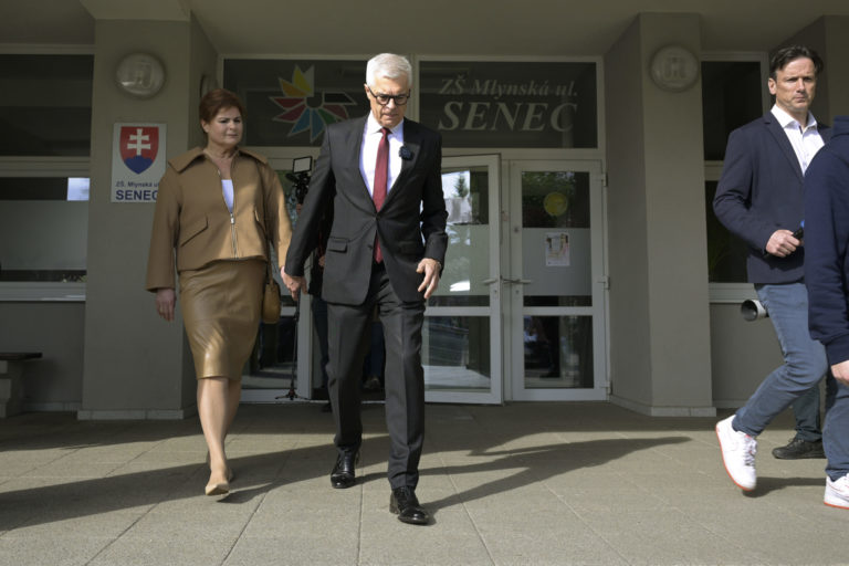 Uprostred sprava: Občiansky kandidát na prezidenta SR Ivan Korčok s manželkou po volebnom akte v rámci 2. kola prezidentských volieb 2024. Senec, 6. apríl 2024. Foto: SITA/Milan Illík