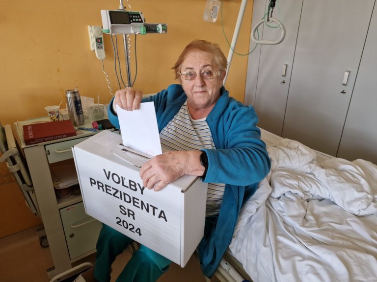 Pacientka Fakultnej nemocnice s poliklinikou J. A. Reimana v Prešove počas volebného aktu do prenosnej volebnej urny v rámci 2. kola prezidentských volieb 2024. Prešov, 6. apríla 2024. Foto: SITA/Ivan Kriššák