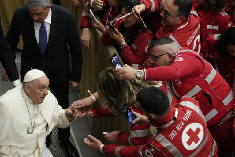 Pápež František sa stretáva s dobrovoľníkmi z talianskeho Červeného kríža. Sobota, 6. apríl, 2024. Foto: SITA/AP