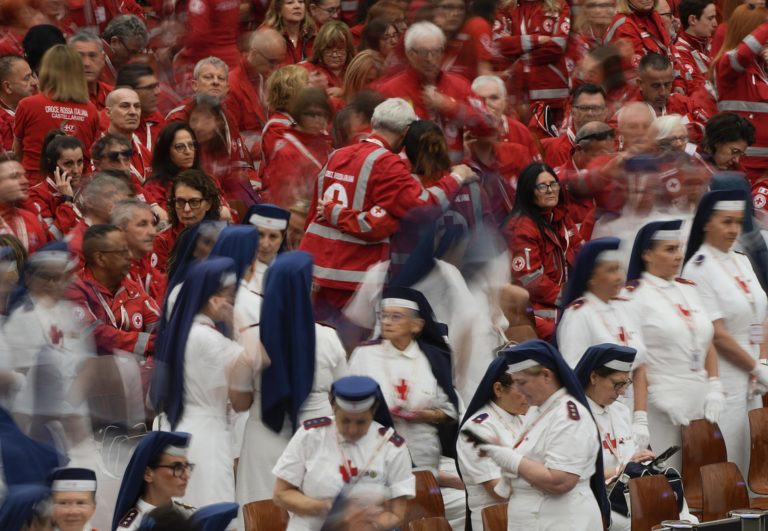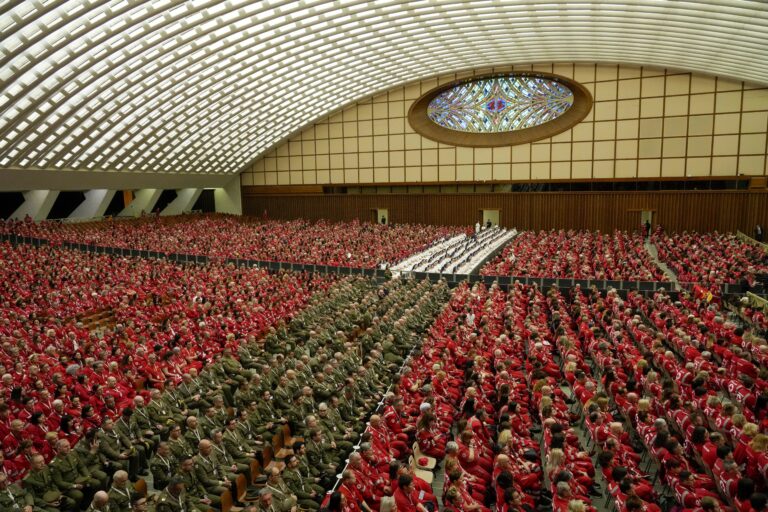 Hala plná dobrovoľníkov talianskeho Červeného kríža na stretnutí s pápežom Františkom. Sobota, 6. apríl, 2024. Foto: SITA/AP
